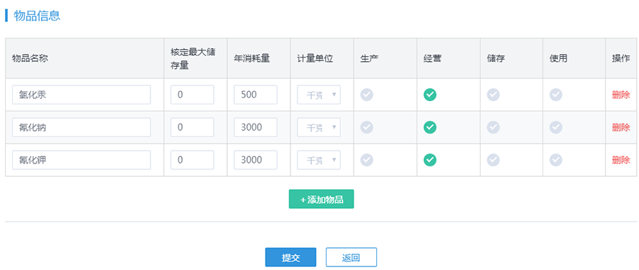 3、化学品品种可根据实际情况增加,点击“添加物品”按钮即可。